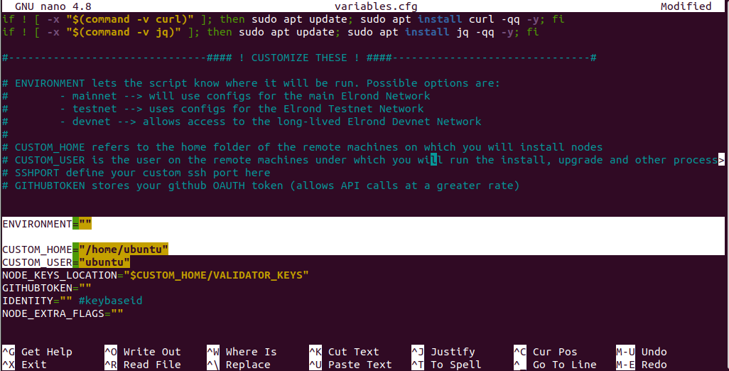 After obtaining your username, open variables.cfg and update the placeholders (CUSTOM_USER, CUSTOM_HOME, ENVIRONMENT) with your actual user information. This is crucial for your node's functionality.
